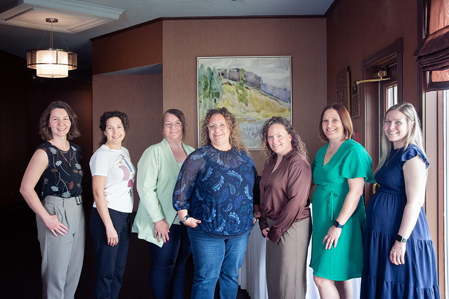 De gauche à droite : Émilie Warren, gestionnaire par intérim des évaluations des besoins des communautés en matière de santé; Marie-Josée Roussel, gestionnaire des activités hospitalières, Hôpital et Centre de santé communautaire de Lamèque; Stéphanie Roy, directrice principale des soins de santé primaires, de l’approche palliative et des soins de fin de vie intégrés; Mélanie Ruest, Première dirigeante par intérim, Commission des services régionaux du Nord-Ouest; July Synnott, consultante en engagement et en gestion du changement; Annie Roussel, directrice adjointe de la Santé publique, et Joanie Gagnon, directrice de la planification organisationnelle.