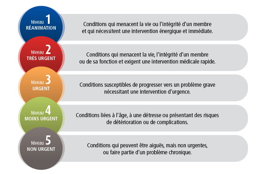 Chaque cas est classé selon une échelle nationale de triage à cinq niveaux, allant de l’état non urgent à la réanimation.