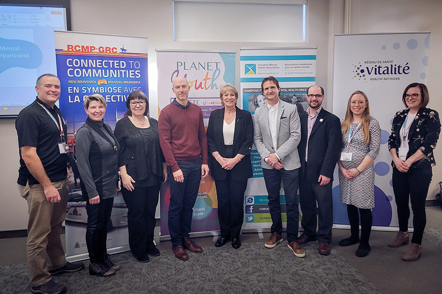 From left to right: Jean-François LeBlanc, Community Program Officer (RCMP); Nancy Bastarache, Regional Director of Public Health; Carole Gallant, Regional Director of Addiction and Mental Health Services for Children and Youth; Dr. Yves Léger, Acting Chief Medical Officer of Health; the Honourable Sherry Wilson, Minister responsible for Addictions and Mental Health Services; Rino Lang, Assistant Vice-President – Professional Services; Paul Lang,, CEO, Kent Regional Service Commission; Chanelle DaPonte, Regional Resiliency Coordinator, Public Health, Vitalité Health Network; and Stephanie Caissie, Social Inclusion and Community Development Coordinator, Kent Regional Service Commission