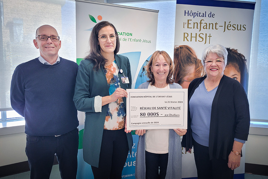 Remise officielle du chèque au Réseau de santé Vitalité. De gauche à droite : Eric Haché, gestionnaire des activités hospitalières, Hôpital de l’Enfant-Jésus RHSJ†; Dre Anick Pelletier, vice-présidente adjointe – affaires médicales, Réseau de santé Vitalité; Christina Mallet, présente du Conseil d’administration de la Fondation Hôpital de l’Enfant-Jésus et Nicole Hébert, maire suppléante, ville de Caraquet