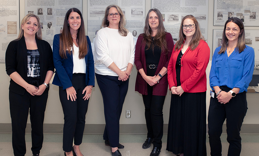 L’équipe du secteur de la formation. Vicky Pellerin, (Adjointe administrative de la mission universitaire), Martine Poirier, (Directrice régionale de la formation et des partenariats en enseignement), Marie-Eve Gingras (Gestionnaire du Bureau de la formation), Louise Doucet (Adjointe administrative du Bureau de la formation), Amélie Haché (Conseillère en formation et en stages pédagogiques) et Micheline Boudreau-Pitre (Conseillère en formation et en stages pédagogiques).