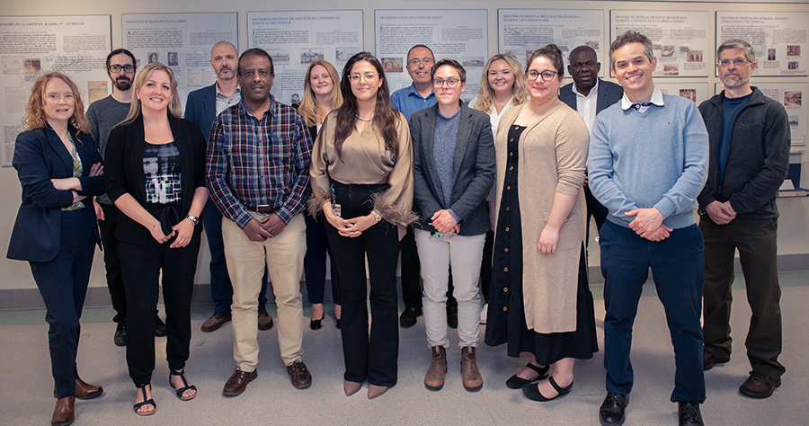 L’équipe de la recherche et de l’évaluation en santé. Au premier rang se trouvent Marie-Josée Plourde (Coordonnatrice de recherche), Vicky Pellerin (Adjointe à la direction), Araya-Yohannes Bekele (Bibliothécaire), Sara Naam (Consultante de recherche), Dominique Comeau (Consultante de recherche), Isabelle d’Entremont (Consultante en gestion du changement) et Breitner Gomes Chaves (Consultant en évaluation). Au deuxième rang se trouvent Marc-André Bouchard (Conseiller en recherche), Jeanot Gauvin (Gestionnaire de l’unité d’appui aux essais cliniques), Erika Dugas (Directrice régionale de la recherche et évaluation en santé), M`hamed Belkhodja (Bibliothécaire), Carly Demont (Consultante de recherche), Evens Datus (Consultant en évaluation) et Marc Robichaud (Consultant de recherche).